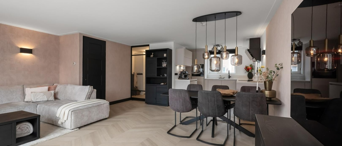 Juist omdat deze vloer in mijn eigen woning ligt, is dit voor mij een mooi voorbeeld van hoe je een Hongaarse punt PVC vloer met band en bies kunt inzetten als luxe basis voor een modern huis.